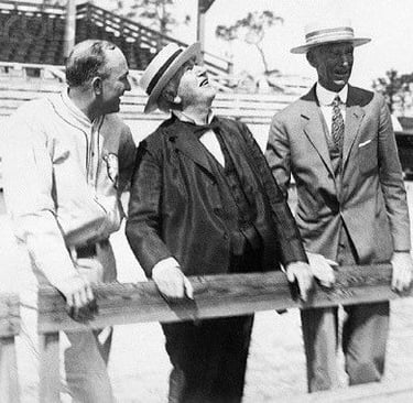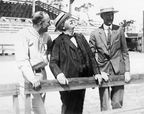 A part-time resident of Fort Myers, Florida, Thomas Edison was thrilled when the Philadelphia Athletics selected the tropical town for annual training camp. In 1926, 80-year-old Edison visited the Fair Grounds and accepted an invitation from Kid Gleason to hit with Connie Mack catching (used Micky Cochrane’s glove). Edison popped Kid’s pitch over first base. Joe Hauser wasn’t in position but the ball would have sailed over his head anyway.